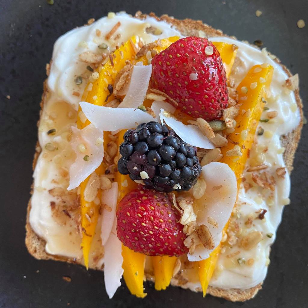 En realidad no hay secreto en este desayuno, así que lo que recomiendo es que utilices un pan nutritivo, ese carbohidrato que aporte beneficios, puede ser alguno de masa madre o uno que sea orgánico con mínimos ingredientes, para el yogurt hay muchísimas opciones, honestamente yo prefiero el griego, que no tiene nada de azúcar añadida, porque me permite usarlo en otras recetas en forma de crema ácida, esta vez utilice el de la marca propia de Costco, es un bote mucho más grande a un mejor precio, aunque también utilizo el de Yoplait o Fage.